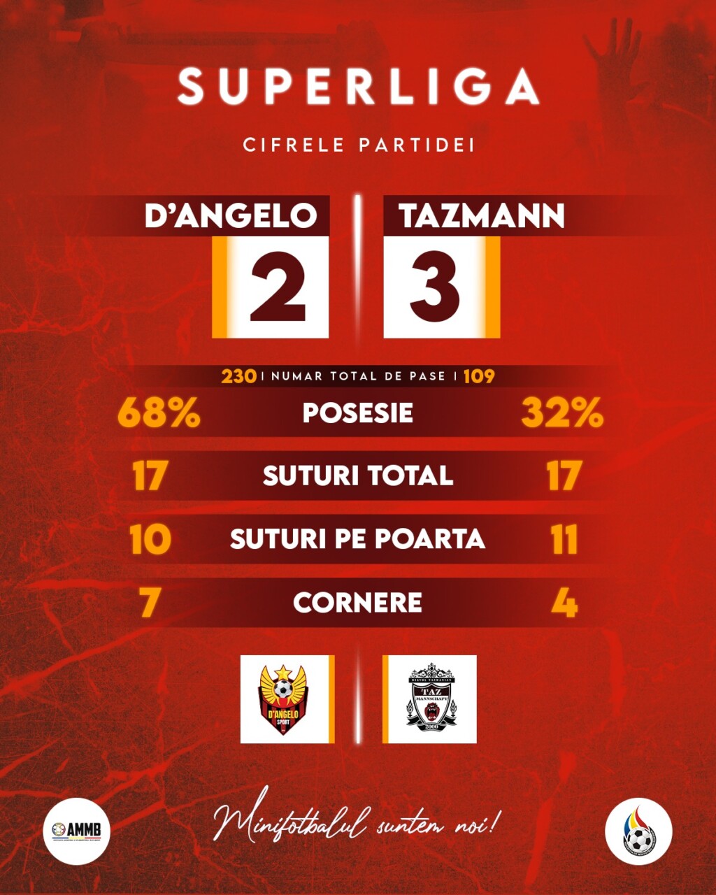 📰 Meciul săptămânii în Superliga a fost un derby cu tradiție in minifotbalul bucureștean. D”Angelo vine dupa un meci perfect cu Real, iar Tazmann dupa 3 puncte obținute la ultima faza cu Union. Doua nume importante din fotbalul romanesc, Sorin Frunza si Stelian Stancu sunt capul de afis in lotul tazmanienilor, in timp ce diavolii aliniază un lot ce îmbină experienta si viitorul. Patru minute sunt suficiente ca tabela sa fie miscata, Stelian Stancu executa un aut rapid, iar Frunza vine fara marcaj si înscrie cu un voleu „a la Zidane”. Asistam la 8 minute de minifotbal tactic, in care ambele echipe lupta pentru posesie. Marin Laurențiu, goalkeeper-ul lui D’Angelo repune repede si il găsește pe Ciupitu, de la margine se aude „tine de ea”, dar acesta găsește colțul lung si face 1-1. Ne apropiem de finalul primei reprize, cand carismaticul Sebastian Vasile plasează un sut de la mare distanță, care il lasa fara reacție pe goalkeeper-ul advers. Repriza secunda este controlata de „milanezi”, care cauta egalarea. La jumătate mitanului secund, D’Angelo restabilește egalitatea, Lolescu insista in banda, iar Ciupitu face dubla. Tazmannschaft nu sta pe ganduri si revine in avantaj dupa doar 50 de secunde. Trei pase desfac apărarea adversa si il lasa pe Stelian Stancu sa îndeplinească o simpla formalitate. Din minutul 31 D’Angelo cauta egalarea, dar fara rezultat. Experiența băieților conduși de Simon Tudor isi pune amprenta si tin tabela nemișcata. 3-2 pentru Tazmannschaft si 6 puncte in clasament.