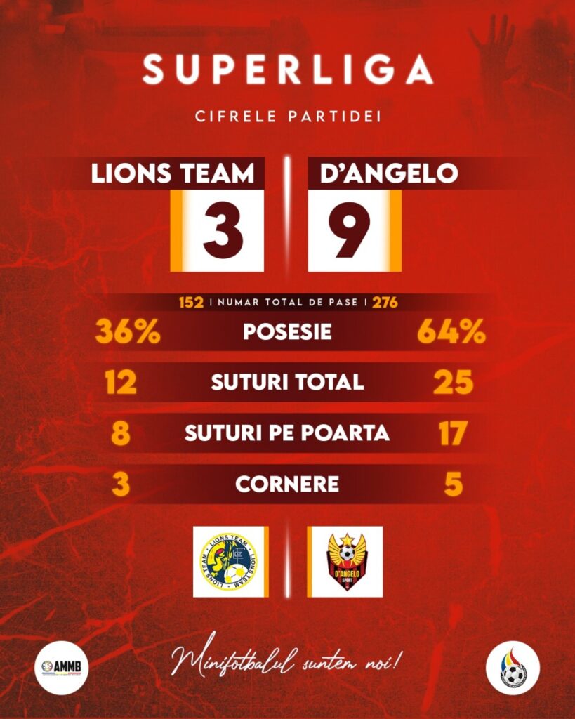 📰 Săptămâna cu numărul 8 a celor mai tari jocuri de minifotbal din Capitală, disputate în Superliga București, a fost deschisă de meciul dintre D’Angelo Sport și Lions Team. Băieții lui Doru Stoica ținteau podiumul după seara de marți, în timp ce Lions căuta prima victorie a sezonului, având un singur punct în 7 etape.